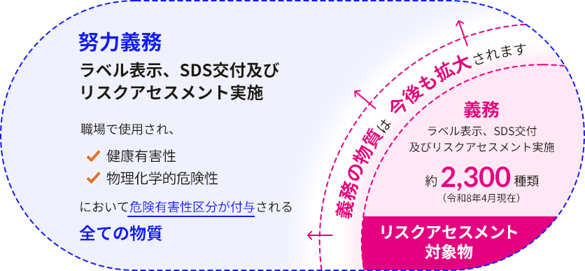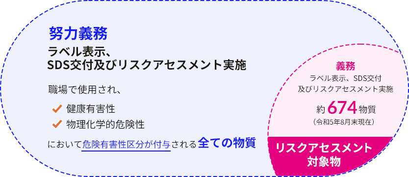 ラベル表示、SDS交付及びリスクアセスメントの実施が義務である物質の数は限られている一方、職場で使用されていて、危険性・有害性を示す物質については、ラベル表示、SDS交付及びリスクアセスメントの実施が努力義務になっているよ!